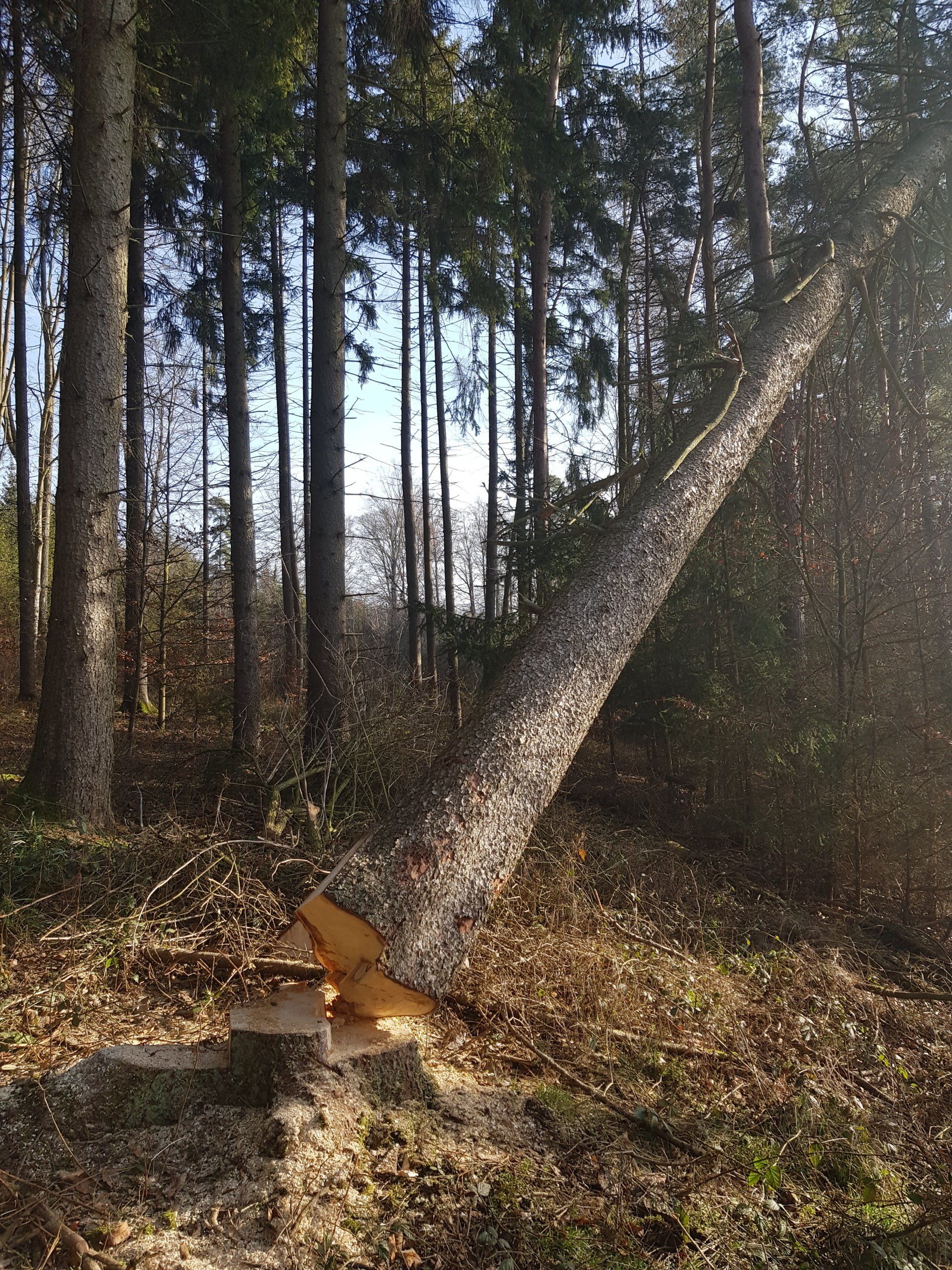 Diesen Baum hatte ich beim Sonntagsspaziergang gesehen und traute meinen Augen nicht: Hier wurde die Bruchleiste beim Fällen durchtrennt und der Baum kippte unkontrolliert in die andere Richtung in den bestehenden Bestand. Dieser Baum blieb so über das gesamte Wochende stehen!